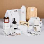 Celebrate with comfort and intention in this white house gift box, where design meets utility in every detail. The Kooyong Charcuterie Board is a striking centrepiece, while Chapter’s Ceramic Coffee Mugs, Laguiole Teaspoons and Marble Coasters elevate morning moments. The included Kooyong Handmade Vase adds sculptural beauty, and the Embre Beachwood Candle and Hand Wash bring a soft, grounding atmosphere. Completed with a Chapter Luxury Towel, this hamper is a thoughtful choice for settlement gifts, stylish thank yous, or quiet milestones.