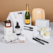 Celebrate stylishly with this elevated home gift, presented in a refined white house gift box. Veuve Clicquot French Champagne sets a tone of elegance, complemented by the Kooyong Charcuterie Board and matching Cheese Knife Set for seamless hosting. The Chapter Sommelier Wine Tumblers and Marble Coasters create a polished setting, while the Embre Beachwood Candle and Cedarwood & Orange Peel Hand Wash add soft scent and calm. A rolled Chapter Luxury Towel completes this gesture—perfect for congratulating new homeowners or thanking with distinction.