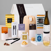 A refined selection of savoury and sweet delights, beautifully presented in a white house-shaped gift box. Perfect for festive gifting or elevated entertaining, this hamper features a bottle of Vandenberg Australian Sparkling alongside a Kooyong Charcuterie Board and Cheese Knife Set for effortless grazing. Lemon jam filled biscuits, shortbread fingers, artisan lavosh, and cinnamon almonds deliver flavour and charm, while choc raspberries, pastilles and caramel popcorn provide a touch of indulgence. A thoughtful and celebratory gesture for any occasion.