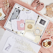 The Luxury Baby hamper is the ultimate indulgence for any new arrival. It features a free pair of michu branded baby UGGs to keep those little toes warm and snug, and a soft and cuddly Rupert & Jane Henry plush bunny for baby to cherish. The hamper also includes a Rupert & Jane full body romper, beanie, and bib that provide comfortable and stylish options for baby's wardrobe. The michu knitted luxury baby blanket is perfect for snuggles and naps, while the Hopscotch mixed chocolate raspberries provide a sweet treat. To complete this luxurious hamper, we've included a beautiful book from Rupert & Jane collection, ensuring that this gift will be treasured for years to come. Spoil a little one with the very best in luxury and comfort with this indulgent hamper.