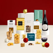 A rich and festive gesture for the holiday season, this hamper features a bottle of Perfect Storm Montara Shiraz alongside a generous spread of gourmet delights - rosemary rock salt crackers, zesty lemon jam biscuits, and a sweet chilli mediterranean mix. A premium chocolate blend and mini salted pretzels complete this cheerful curation, perfect for sharing or indulging solo. Beautifully presented in our First Class Hampers luxury Christmas gift box. (14.5% ACL/VOL)
