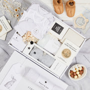 Celebrate the arrival of a new baby with the Snuggle Baby hamper, a delightful and thoughtful gift set. This beautifully curated hamper includes a free pair of michu Baby UGGs to keep those tiny toes both stylish and warm. The soft and cuddly Rupert & Jane Henry plush bunny provides endless snuggles, while the practical yet stylish Rupert & Jane swaddle wrap, long sleeve romper, beanie, bib, and singlet are all wonderful additions to any little one's wardrobe. The michu fleece cloud baby blanket is perfect for snuggling up in, and the hamper's Hopscotch mixed chocolate raspberries add a delicious treat for the parents. For added entertainment, the hamper also includes a michu teether. Also included is a book from Rupert & Jane, providing hours of entertainment. Give the gift of snuggles with the Snuggle Baby hamper, a lovely way to welcome any new arrival with warmth and comfort.