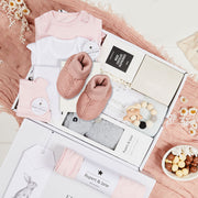 Celebrate the arrival of a new baby with the Snuggle Baby hamper, a delightful and thoughtful gift set. This beautifully curated hamper includes a free pair of michu Baby UGGs to keep those tiny toes both stylish and warm. The soft and cuddly Rupert & Jane Henry plush bunny provides endless snuggles, while the practical yet stylish Rupert & Jane swaddle wrap, long sleeve romper, beanie, bib, and singlet are all wonderful additions to any little one's wardrobe. The michu fleece cloud baby blanket is perfect for snuggling up in, and the hamper's Hopscotch mixed chocolate raspberries add a delicious treat for the parents. For added entertainment, the hamper also includes a michu teether. Also included is a book from Rupert & Jane, providing hours of entertainment. Give the gift of snuggles with the Snuggle Baby hamper, a lovely way to welcome any new arrival with warmth and comfort.
